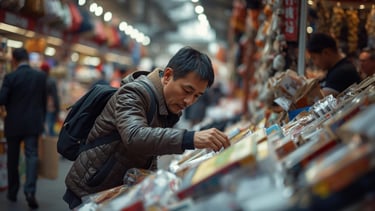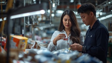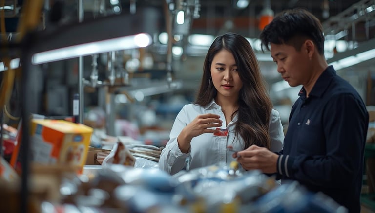 Photo of a professional inspecting products in a busy Yiwu market.